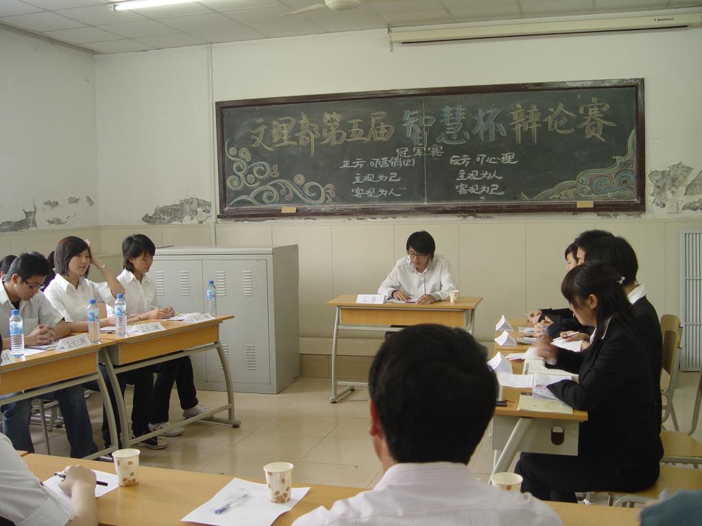 由文理部主办第五届“智慧杯”辩论赛总决赛于5月5日下午在东院教学楼隆重拉开帷幕。文理部辩论赛历时七周,于07、08年级各班当中火热展开,在经历了三轮淘汰赛后,07营销2班和07心理班成功打入总决赛。文理学办王楠老师和学生会正副主席及部长出席并担任本次大赛评委。决赛现场气氛浓厚,同学们都怀着激动地心情关注着本次比赛中各代表队的表现。