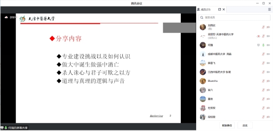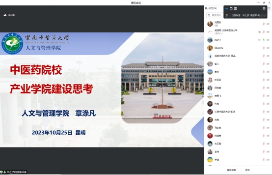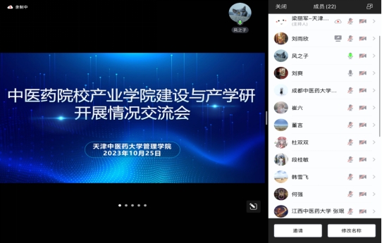 为提高中医药产业学院的教育教学质量、推动产学研一体化发展,共同探讨产业学院的建设途径以及与企业合作开展课题研究与课程建设等多方面产学研实施的途径,10月25日,由天津中医药大学管理学院主办的中医药院校产业学院建设与产学研开展情况交流会通过线上会议形式成功举办。云南中医药大学人文与管理学院院长章涤凡,江西中医药大学经济与管理学院张珉教授,成都中医药大学管理学院市场营销教研室主任周晶,管理学院市场营销教研室段桂敏教授,天津中医药大学管理学院院长何强、副院长刘爽及学院各专业老师参加交流会。会议由天津中医药大学管理学院市场营销教研室主任梁丽军主持。