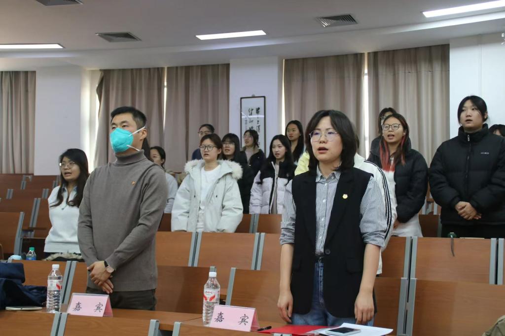 仪式伊始,全体参会人员肃立起身,奏唱中华人民共和国国歌。激昂雄壮的旋律回荡在室内,每一个音符都承载着青年一代的责任与担当,让在场者心中涌起强烈的爱国情怀与集体荣誉感。随后,李婷婷老师庄重宣读2025年度新晋入团成员名单,当一个个名字被念出,新团员们眼中闪烁着激动与自豪的光芒。