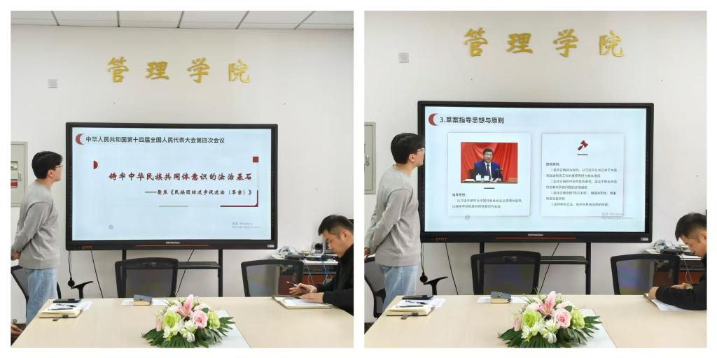会议伊始,那吉达提・热甫克提老师带领同学们聚焦中华人民共和国第十四届全国人民代表大会第四次会议中的热点《民族团结进步促进法(草案)》,从十四届全国人民代表四次会议的基本情况,草案的指导思想与原则,草案的主要框架,总结与展望等多个方面向同学们进行介绍,进一步铸牢中华民族共同体意识中的法治精神。