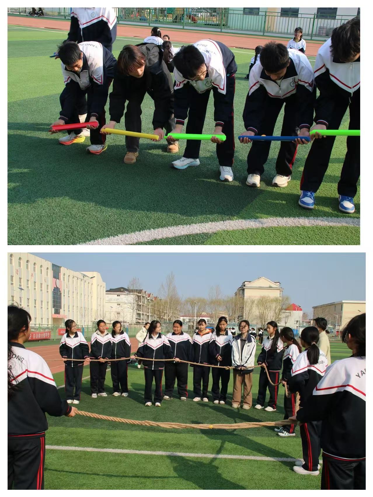 首场游戏“聚力成方”中,队员们默契配合,用长绳共同摆出规整的矩形。以绳为契,以心为方,在协作中凝聚集体力量。第二场游戏“珠联璧合”则要求队员借助竹筒接力传递乒乓球,大家屏息凝神、精准衔接,在专注与配合中提升团队默契。第三场游戏“同心筑塔”将活动推向高潮,成员们各自拉住连接中央吊钩的绳索,通过精准控制力度与方向,将地面上的积木逐一吊起、搬运并堆叠成塔,全程不得用手直接触碰,充分考验了团队的协作与专注力。
