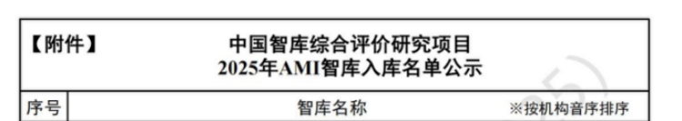 中国智库综合评价研究(AMI)是由中国社会科学评价研究院于2015年首次组织的具有相当权威性和影响力的全国性智库评价活动。该评价每四年开展一次,旨在遴选和推介一批在全国范围内综合实力强、专业特色鲜明、决策影响力突出的优秀智库。该评价依托自主研创的“智库综合评价AMI指标体系”,围绕咨政建言、理论创新、舆论引导等六项特色指标进行多维评估 。评估通过吸引力(Attractive Power)、管理力(Management Power)和影响力(Impact Power)三维度构建评价体系,遴选具有专业特色和决策影响力的智库名单。
