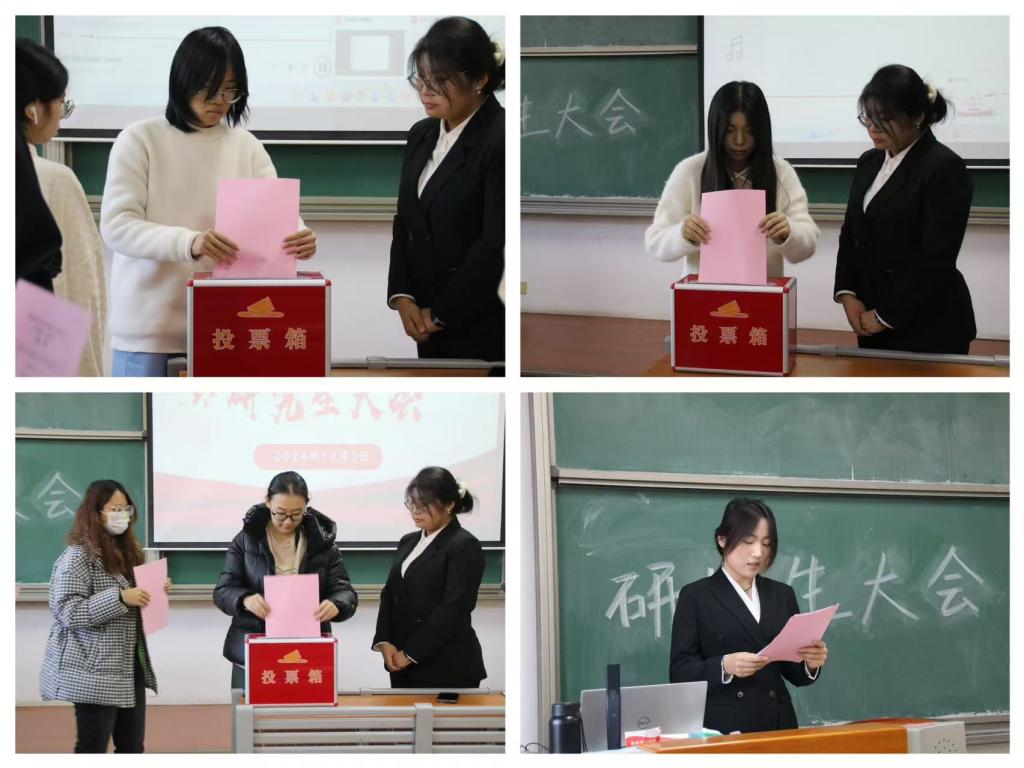 本次选举采用差额选举的方式,从4名候选人中选举产生了3名管理学院第一届研究生会主席团成员,并从另4名候选人中选举产生了3名出席天津中医药大学第四次研究生代表大会的代表。选举过程严谨有序,研究生同学依次进行投票,监票人现场开箱清点选票,确保了选举的公平公正和有效性。